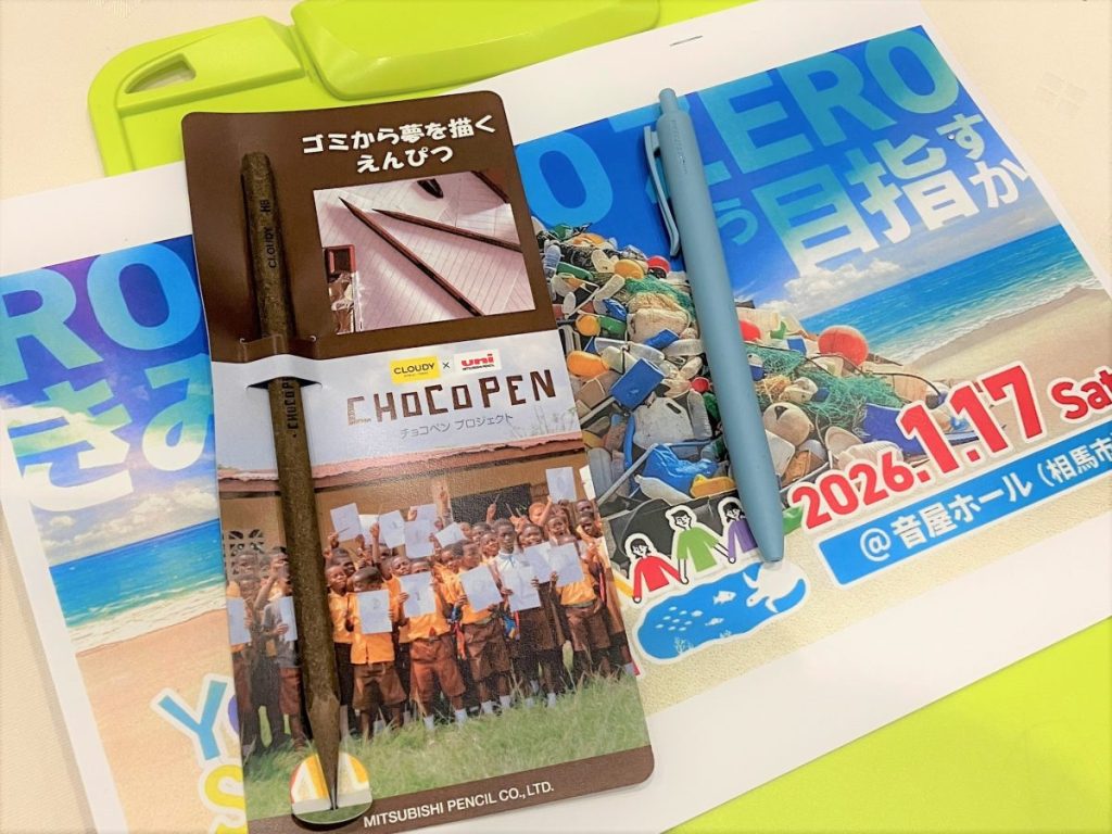 参加者全員に、海洋プラスチックを使ったジェットストリームと、カカオからチョコレートを作る際にでる廃材で作られた「CHOCOPEN(鉛筆)」が全員に配られました。