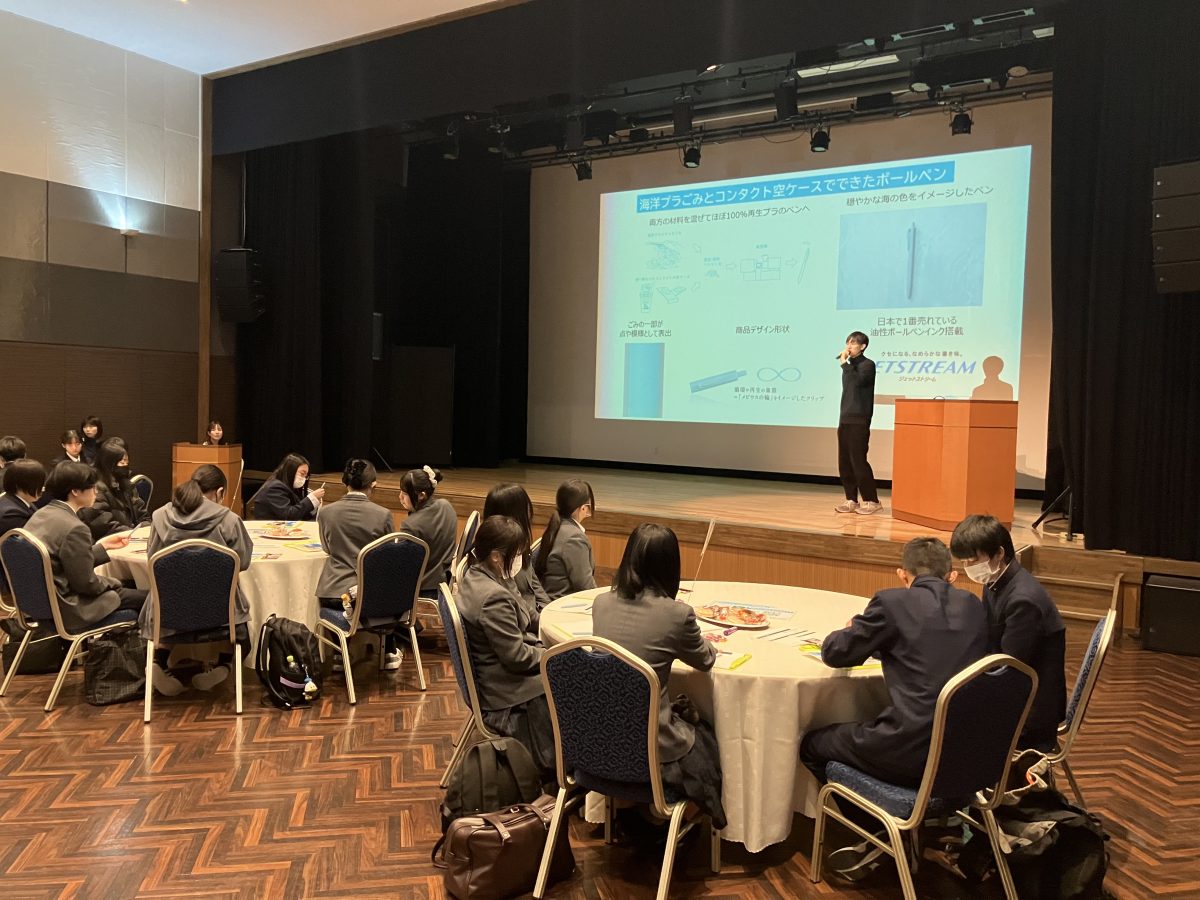 基調講演では三菱鉛筆から講師を迎え、海洋プラスチックを使ったジェットストリーム(ボールペン)を製作する過程や素材循環にまつわるストーリーなどをお話いただきました。